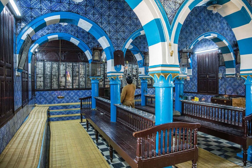 參觀著名的傑爾巴猶太教堂,了解該島的宗教歷史,該猶太教堂由在所羅門神廟被毀後尋求避難的猶太人建造。前往附近的傑爾巴胡德村,沿著大氣的小巷欣賞街頭藝術。最後,前往島上的首府呼門蘇克 (Houmt Souk),您將有空閒時間漫步在狹窄的街道上,探索色彩繽紛的市場。