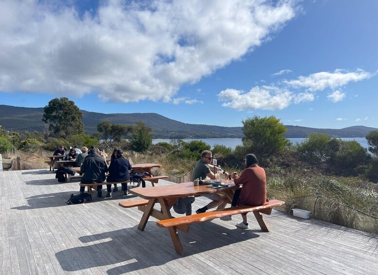 我们在 Two Tree Point 停下来了解一些当地的历史,然后在冒险湾享受当之无愧的午餐休息——这是一个令人惊叹的海滩,有白色的沙滩、蓝色的海浪和海岸边高耸的桉树。午餐非常灵活:您可以在海滩上野餐放松,在当地的咖啡馆吃点东西,或者在 Pennicott 的海滨餐厅坐下来享用一顿美餐。