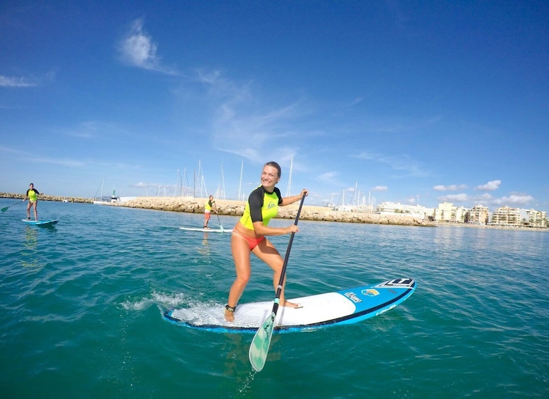 学习站立并在初学者桨板上划桨。从 Ca'n Pastilla 海滩开始,这是马略卡岛非常受欢迎的水上运动场所。