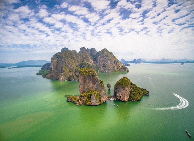 乘坐正宗的泰國長尾船探索著名的攀牙灣。欣賞該地區石灰岩的完美景色,並參觀 Ko Tapu(詹姆斯·邦德岩石)。乘坐獨木舟放鬆身心,享受大自然。在 Koh Panyee 吃午餐,這是一個建在水面上的海上吉普賽村莊。